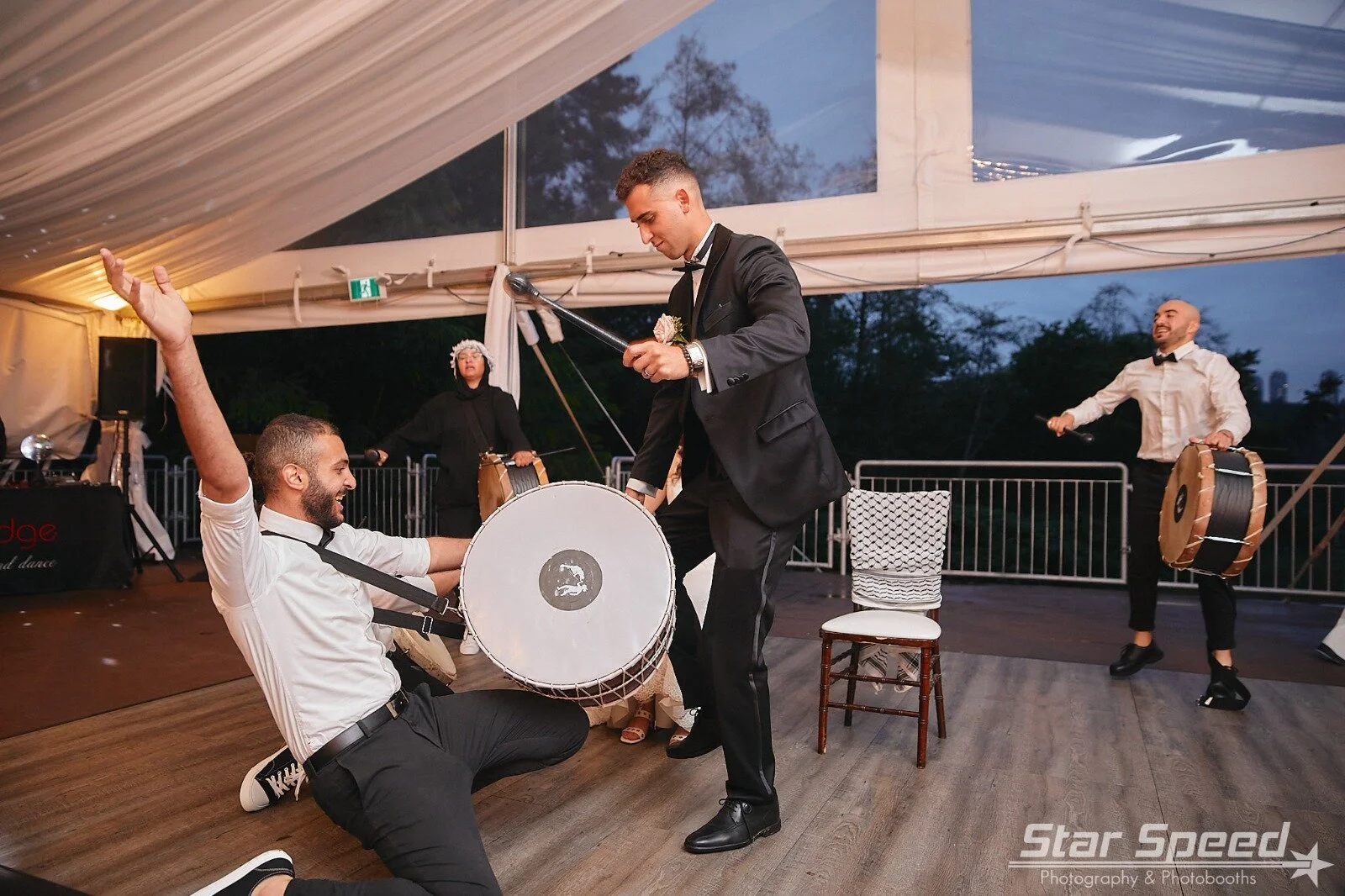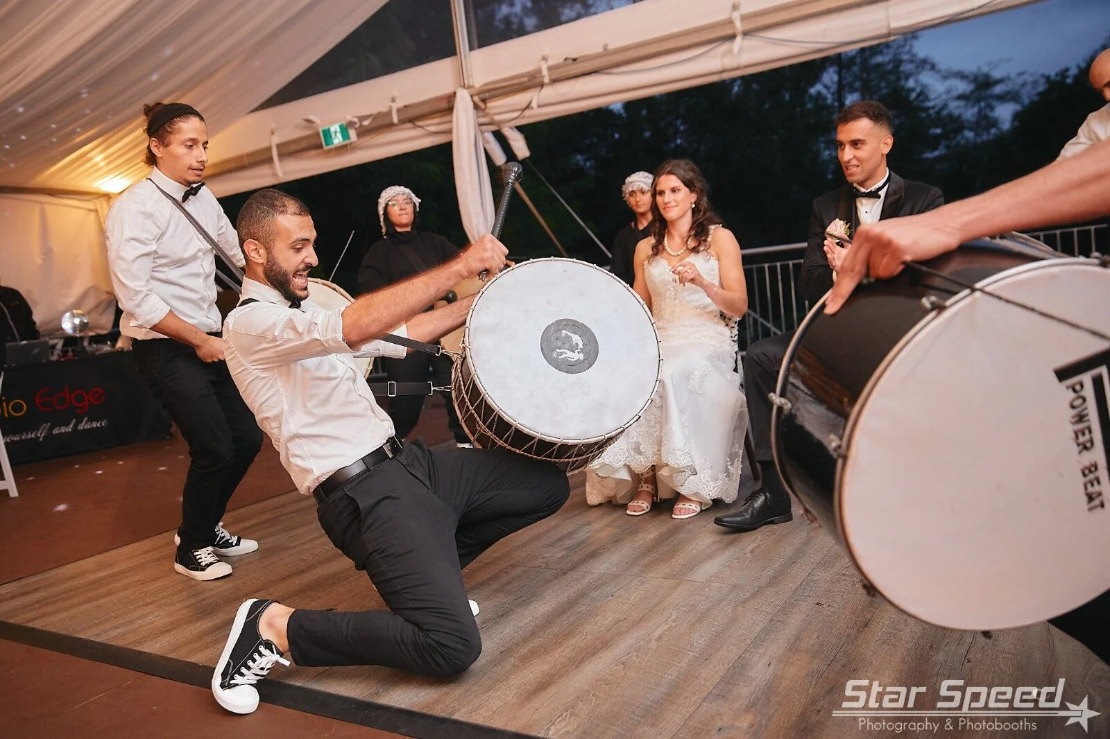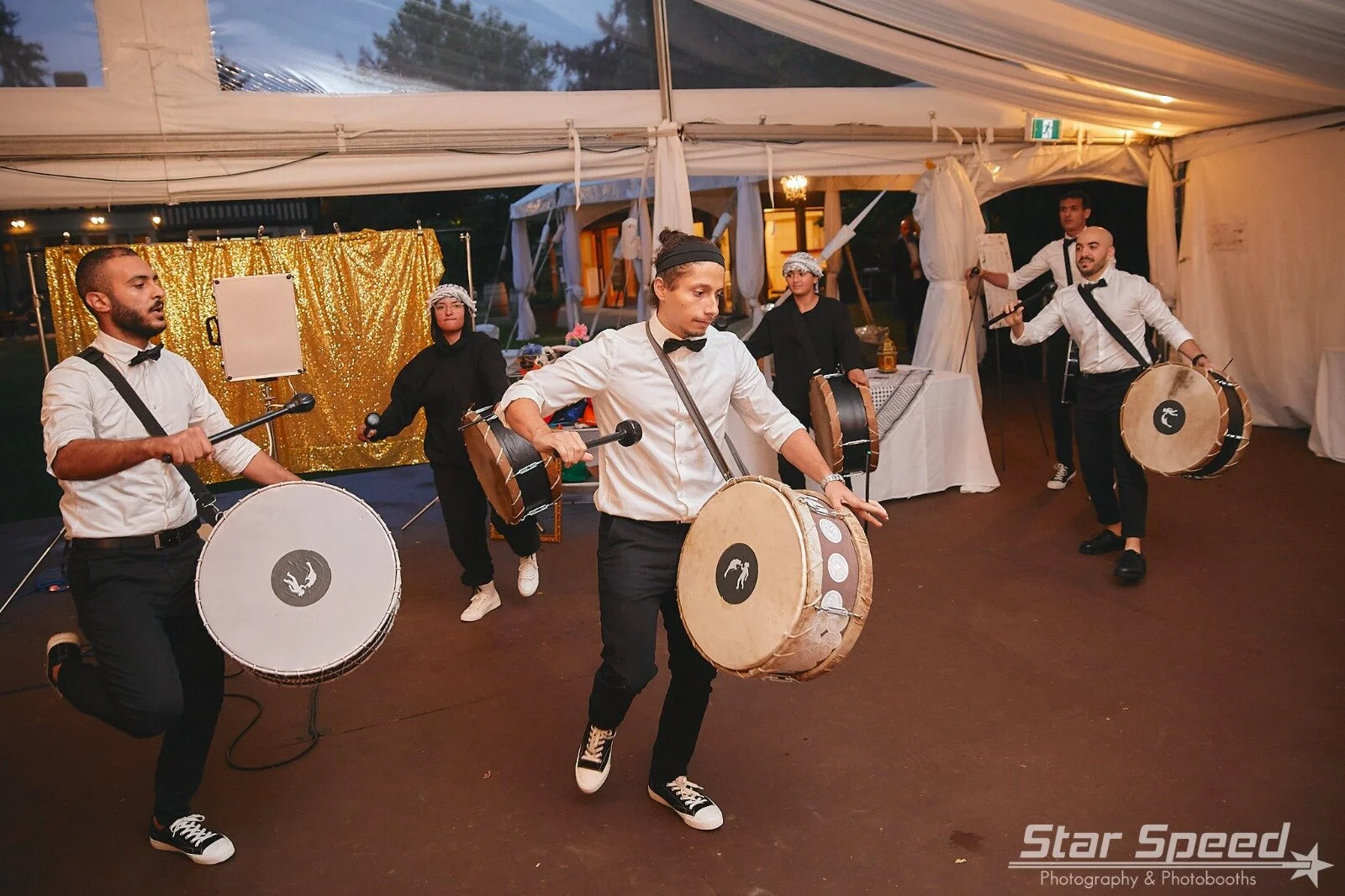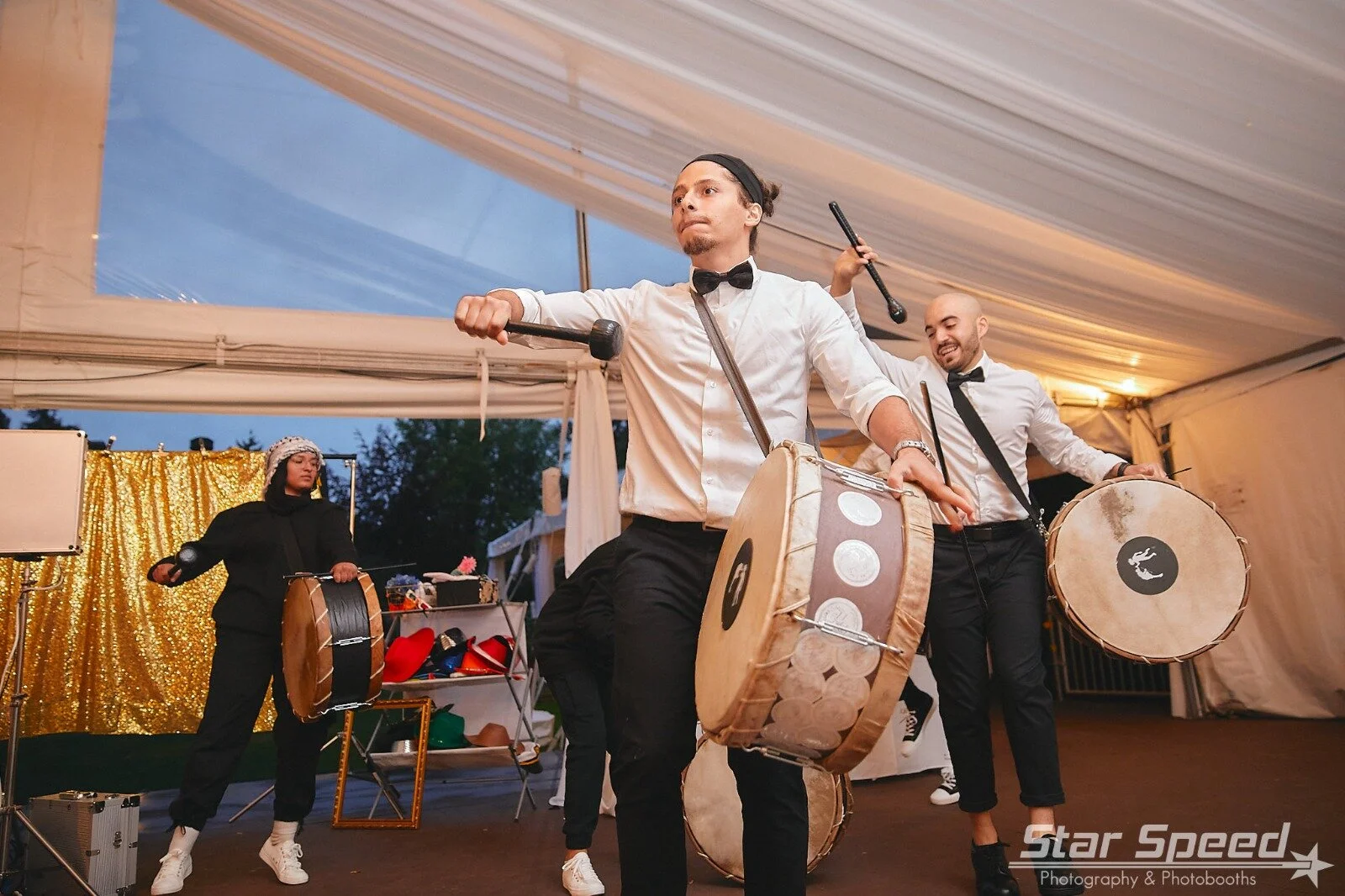 Musicians playing drums at a wedding reception under a large tent, with guests seated at tables watching and taking photos.